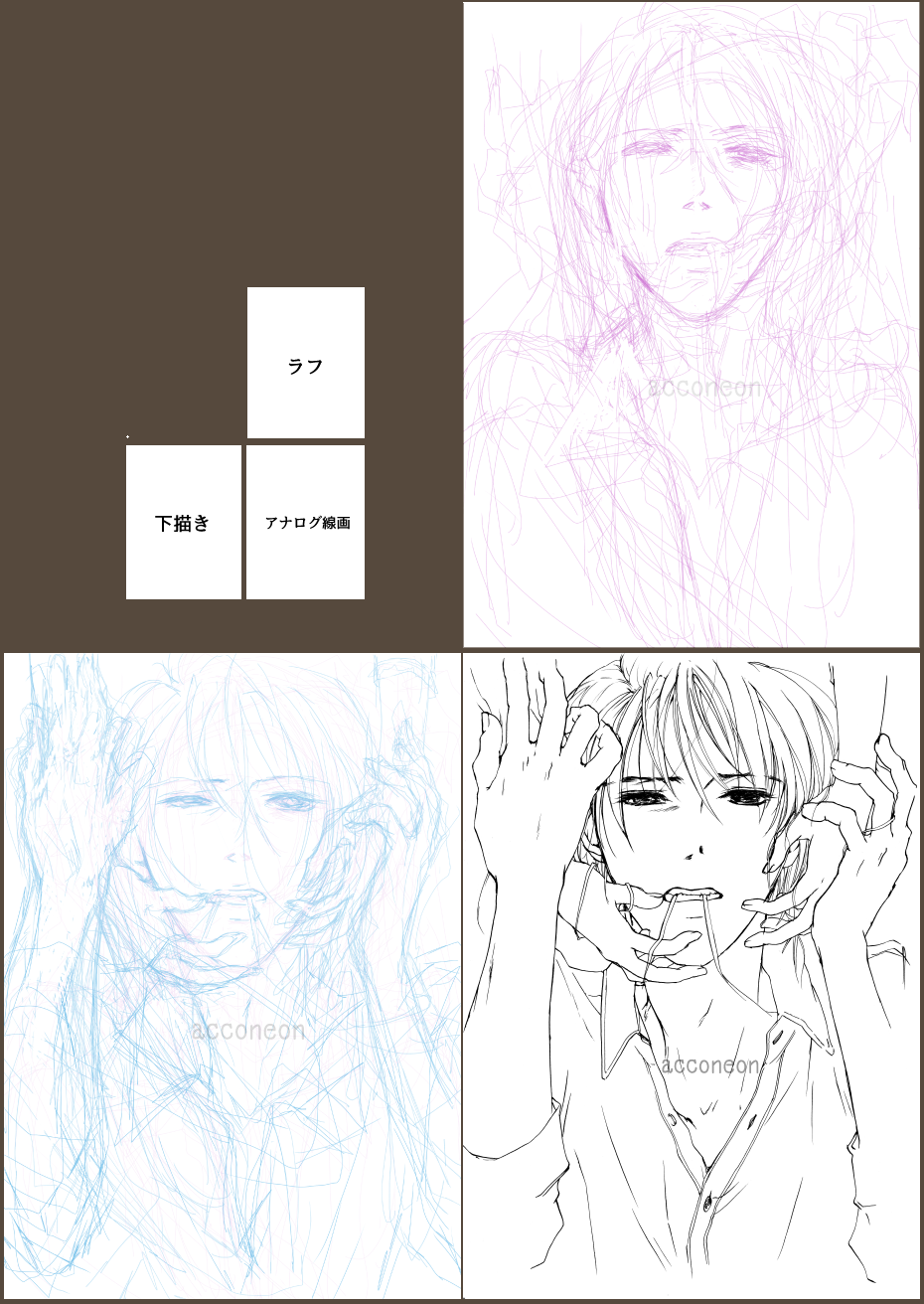下の二枚はサムネイルなのでクリックすると大きくなったりするはずです。下描き2010年6月仕上げ2014年5月恐ろしいです。4年間思い出してはたまに手を入れて挫けて放置してはやはり気になって掘り出してまた、を繰り返していました。恐ろしい。下の二枚は差分と過程です。自分への覚え書きも兼ねて上げさせてもらいました。